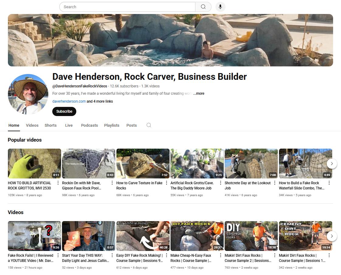 You'll find lots of free content to get you going as well as for sale products. I cover everything that goes into building high quality faux rock projects like tools, proper techniques, mix designs, as well as tips and tricks that I've learned along the way. I also cover the subject of creativity itself, project design, art theory, as well as business advice.